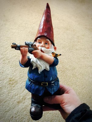 [This review was collected as part of a promotion.] This is a fun decorative gnome with a gun! I liked the added detail of the bird sitting on his arm which makes the gnome look more the hunter. I currently have this placed in a flower bed to warn squirrels to stop digging up my tulip bulbs. This armed gnome has gotten a lot of attention, laughs and smiles from family, guests and neighbors. The gnome also gets attention because it is such good quality and so nicely made. This is actually a lot nicer than I expected for an outdoor ornament. It is so nicely made it could easily be used as an indoor decorating item if you like gnomes. The material this is made from is polystone which is new to me and is lightweight. The gnome has a lot of detail and it looks and feels very much like carved wood. The paint and colors used are also very rich and detailed. The gnome is a nice size; not too big or too small and will look great amid my flowers when they come in this spring and summer.