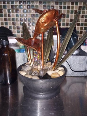 Beautiful 12 inch metal sculpture Fountain. Very quiet motor, colors are vibrant and probably would add to any decor.