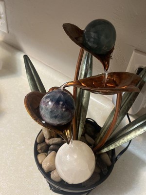 - INDOOR TIERED TABLETOP FOUNTAIN: Features an exotic multi-tier copper-colored floral leaf design and stone-filled base with an interior pump that keeps the water flowing - just plug it in!