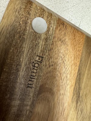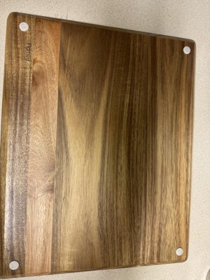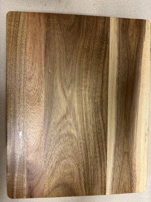 Chopping and dicing ingredients for your favorite recipes will be a breeze with this 12-Inch x 15-Inch Nonslip Acacia Wood Cutting Board from Figmint™. This acacia cutting board's natural wood finish offers a classic, aesthetically pleasing look you're sure to love, and it can be hand washed for easy cleaning. Plus, tapered edges for easily lifting the board off your countertop and nonslip feet that grip the countertop to keep it in place both help you minimize dropped ingredients.