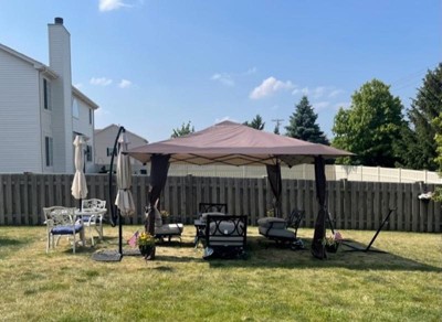 I am pleased with my popup gazebo. It came timely and was easy to install. I would have liked it to be a little sturdier but overall I’m satisfied! Great for the money.