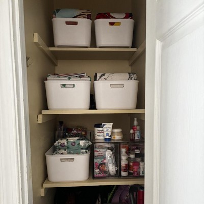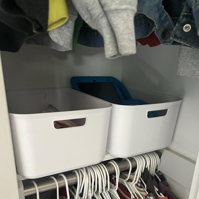 [This review was collected as part of a promotion.] I got the white two pack of open storage tubs from Brightroom to help me organize. I used these in my kids closets and they fit perfectly on the shelf! They are sturdy but can also bend a little bit in the middle so they can squeeze on a shelf together. I like how clean these look and can be used anywhere in my house. These tubs also have cut out handles to make it easy to grab too. I received an incentive to write this review.