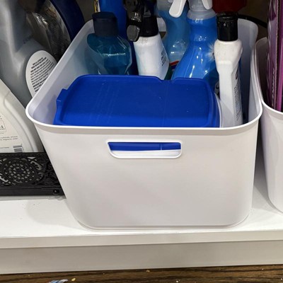 I love these bins they are very versatile. I have this size and several of the other smaller sized ones. I use these under the sink for cleaning product’s and storing microfiber rags in my laundry room.