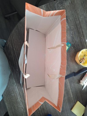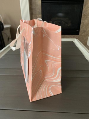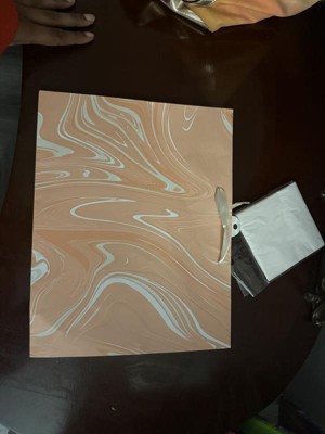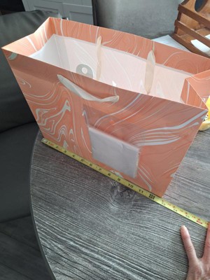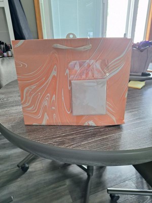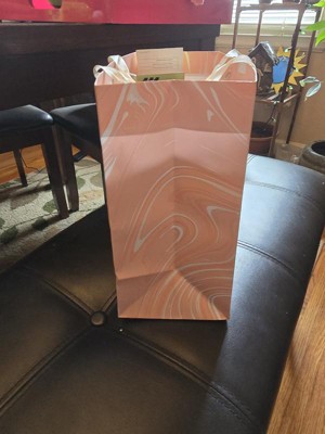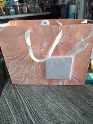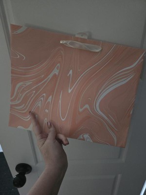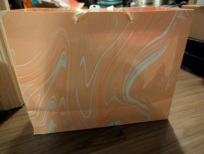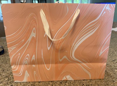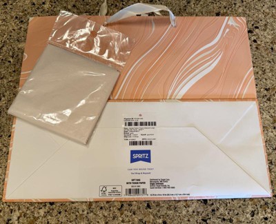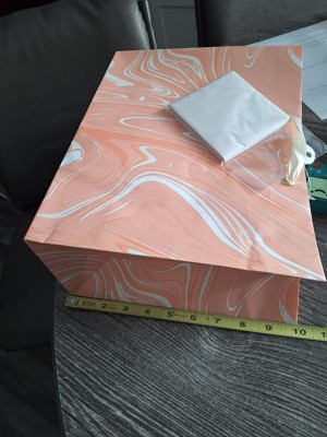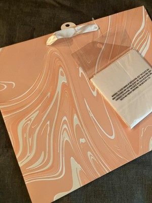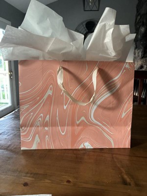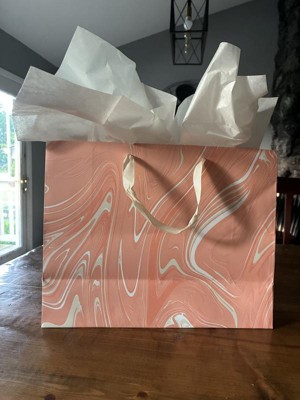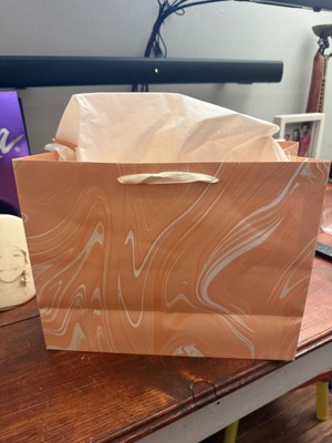 Make your gifts stand out with the 12.61"x10.56"x1.26" Marble Pattern Peach Iridescent Large Gift Bag with Tissue from Spritz™. This stylish bag features a sophisticated peach marble design, perfect for any special occasion. Its large size is ideal for bigger presents, and the included tissue paper adds a finishing touch. Simple, elegant, and full of charm, this gift bag makes wrapping gifts a breeze. Perfect for birthdays, holidays, or any celebration where you want to impress.