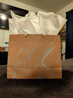 A: The stylish peach marble design and included tissue paper make wrapping gifts simple, elegant, and charming.