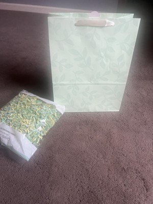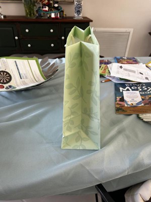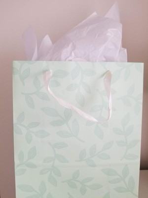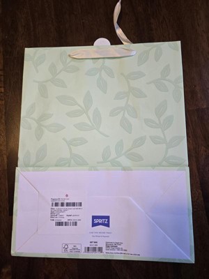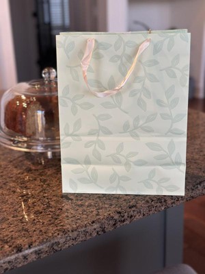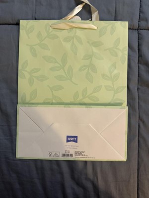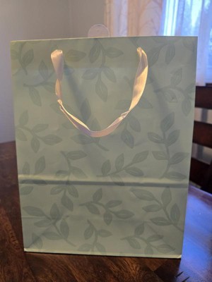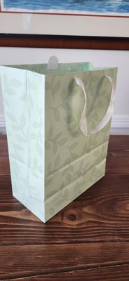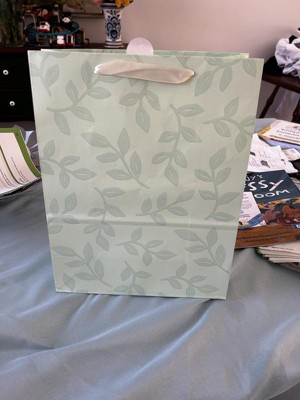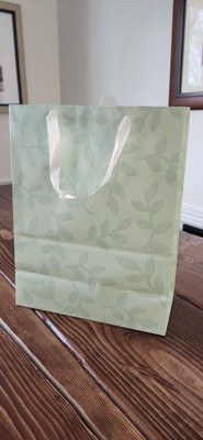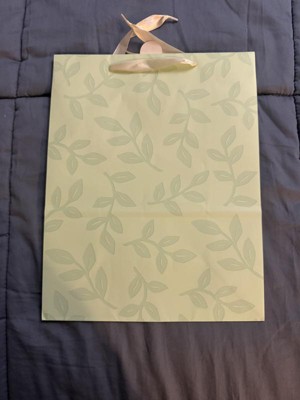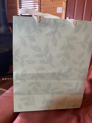 The tonal green leaf motif on the light green background is perfect for any spring gift-giving occasion, like Mother's Day or any springtime birthdays or showers. The ribbon handles are a pale yellow. This is a standard size gift bag with sturdy paper construction.