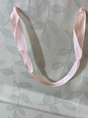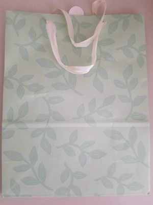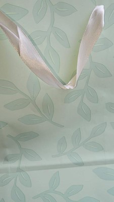 A high quality medium sized gift bag with a floral pattern. The thickness of the paper is solid and the ribbon handles are a nice touch as well - although a heavy item placed in the bag might pull the tabs through the holes. The leaf pattern is subtle and hints of spring.