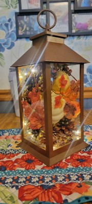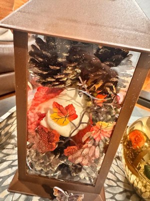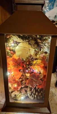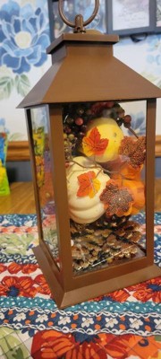 - Autumn-themed Harvest Lantern equipped with 10 battery-powered LED lights and neatly decorated with fall-colored pumpkins, leaves, flowers, berry clusters and pinecones.