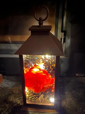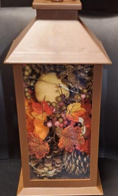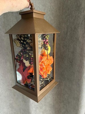 This lantern decoration is constructed of high-impact plastic with a matte finish. Inside the lantern is a filling of fall-themed items including pinecone, flowers, gourd, leaves and berries. Also inside are mini battery operated LED lights that give off a soft sparkle for added charm. For indoor or outdoor display on tabletop or hanging from loop.