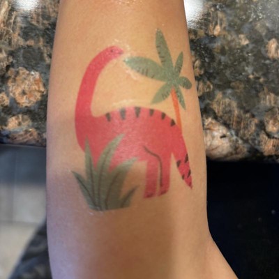 A: The tattoos feature themes like dinosaurs, cake, pizza, and more.
