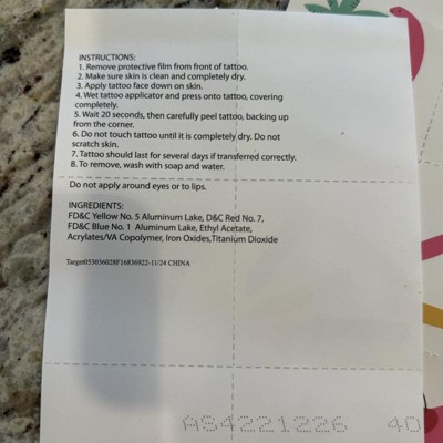A: Hello Abby - Thank you for your interest on - 12ct Temporary Tattoos. The ingredients are- FD&C yellow No. 5 Aluminum lake, D&C Red No. 7, FD&C Blue No. 1, Aluminum lake, Ethyl Acetate, Acrylates/VA Copolymer, Iron Oxides, Titanium Dioxide. Hope this helps. - Rose