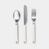 Keep your everyday dining setup simple with this 12-Piece Flatware Set with Caddy from Room Essentials™. This set includes four forks, four spoons and four knives designed with a modern look. The utensils pair metal heads with rectangular plastic handles, and the matching caddy keeps everything organized in one place, with a circular base and individual hooks that let each piece hang neatly for quick access.