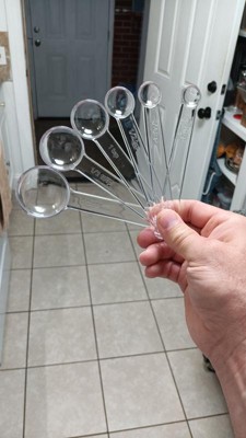 These are just what I needed. I kept losing pieces and wanted to start over with a new set. These clear measuring spoons and cups are perfect! They nest together easily for storage. And they wash easily between uses. Great value and highly recommend!