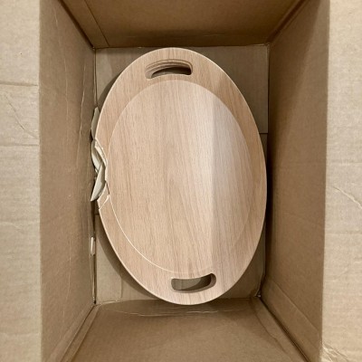 Delight your guests by serving delicious treats on this Serving Tray with Handle from Room Essentials™. Made of melamine, this cream serving tray features raised edges and two handles for easy portability. Designed in an oval shape, this tray is ideal for serving fruits, cookies, and other treats. Plus, it's dishwasher safe for hassle-free cleaning.