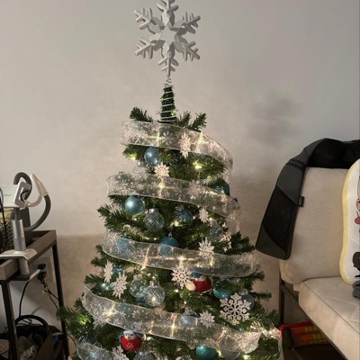 A: The tree topper features a snowflake design, adding a wintry charm to your tree.