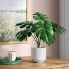 Create an eye-catching focal point in your indoor setting with this Artificial Monstera Potted Plant from Room Essentials™. This artificial potted plant showcases a lush green monstera inside a white melamine pot with faux soil filler for quick and easy display. Place it on your kitchen counter, windowsill, entryway console or any other spot to add a natural touch without the need for any watering.