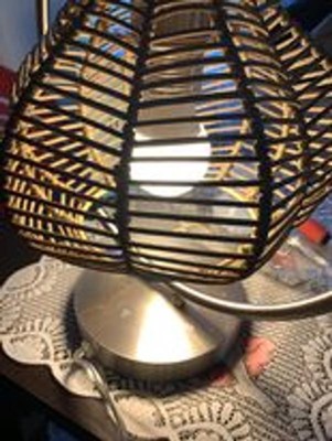 [This review was collected as part of a promotion.] This 13.75in Brushed Nickel-Colored Table Lamp with Round Tan Rattan Shade,is great for a corner desk, it Lucan light up a room but not bright enough to not blind ya , perfect for evening work. Plug it in and push the button and that on the cord.