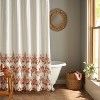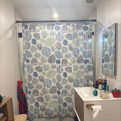 I grabbed what I thought was a plain ivory curtain for our circa 1954 peach bathroom, and was surprised when I opened the package and found the ikat print. It was even more surprising that it looked terrific with the tile! Fabric is a little flimsy, so one star removed, but it’s for a bathroom, so not a deal breaker for me.