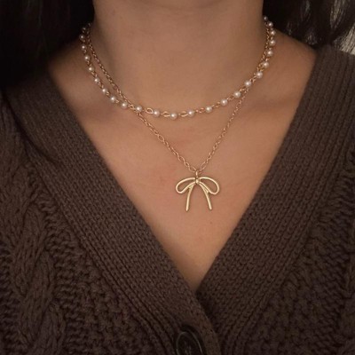 [This review was collected as part of a promotion.] This necklace set is super cute. The pearls are simple and pretty and the bow necklace adds just enough charm without looking childish. I really like that the two necklaces are separate pieces, so you can wear just one for a more low-key look or layer them together if you want something extra. They sit nicely on the neck and don’t feel heavy at all. For the price, they look more expensive than expected.