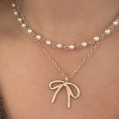 Two-piece acrylic pearl and bow necklace set from Wild Fable™ in a gold-tone finish. Features a 14-inch chain dotted with white faux-pearl beads and a 16-inch chain with round and oval links and a gold-tone bow pendant. Each comes with a 3-inch extender chain and a lobster claw clasp closure.