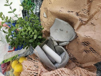 A: The plant comes in a gray cement pot that complements various decor styles.
