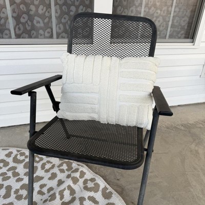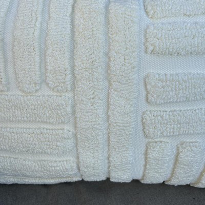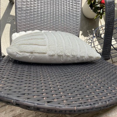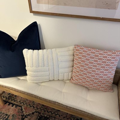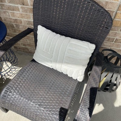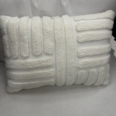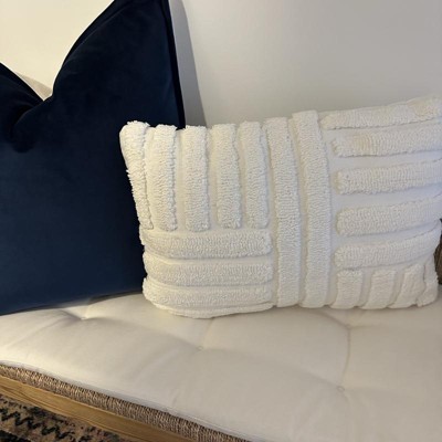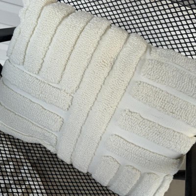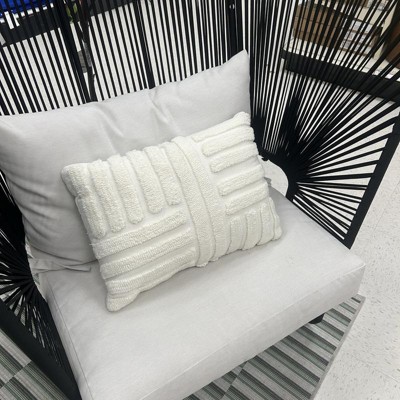 Enhance your seating with the textural charm of this Mod Tufted Outdoor Lumbar Pillow from Threshold™. This rectangular canvas pillow showcases tufted bands on a white backdrop for an elevated look. Designed with a recycled polyester exterior and 100% polyester fiber filling, this outdoor lumbar pillow is perfect for adding comfort to any chair, sofa, bench or lounge chair on your porch, deck or patio.