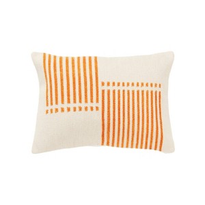This 14" x 20" accent pillow from Rizzy Home brings together the best of modern industrial and ultramodern design elements. Constructed in a cotton and rayon blend, this woven pillow is both ultra soft and super durable, perfect for lounging on your couch or adding an extra layer of comfort and trendy design to your bedding ensemble. The knife edged pillow is crafted with cotton chenille woven in as a color element, giving it a textural offset stripe block design that adds a touch of sophistication to your space. The coordinating solid back with hidden zipper closure allows for easy removal and cleaning. This accent pillow features a bold colorway of natural and orange that is both fashionable and on-trend. The stark contrasting tones creates a clean and modern design that will elevate the look of any room in your home.