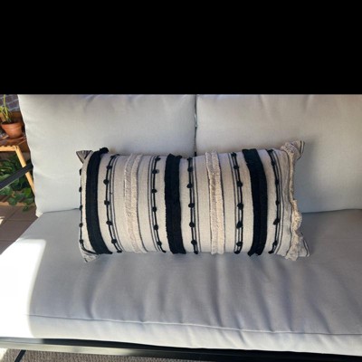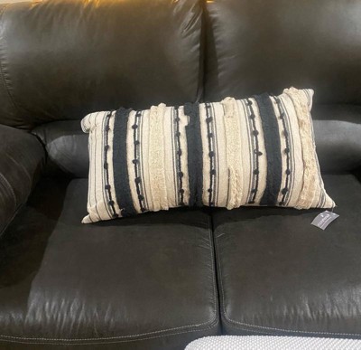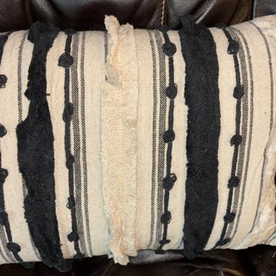 14"x26" Oversized Poly-Filled Striped Lumbar Throw Pillow Black/Ivory - Rizzy Home: Canvas, Hidden Zipper, Removable Cover