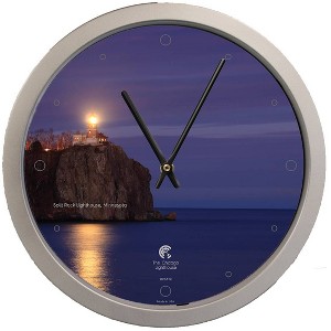 Assembled in the USA by people who are blind. Lighthouse Split Rock 14.5 In. Silver Contemporary Body Quartz Movement Decorative Wall Clock Split Rock Lighthouse, sits on the rugged northshore of Lake Superior in northern Minnesota and is vividly displayed in a decorative 14.5 inch contemporary frame.