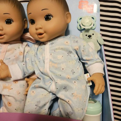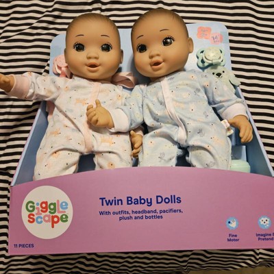 Give your tiny tot a cute option for play with the Boy Girl Twin Baby Dolls from Gigglescape™. These baby dolls are dressed in printed pajamas and have black hair and brown eyes. The set includes two pacifiers, bottles, dog plush pacifier attachments and 1 headband. These baby dolls make a great addition to your baby's toy collection or a perfect gift option.