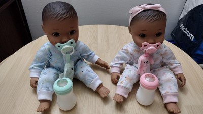 - Includes 2 baby dolls, pajamas, pacifiers, bottles and plush pacifier attachment