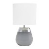 A little metallic detail transforms this traditional 14" lamp to a modern and contemporary delight! This two toned table lamp maintains a sleek look with a linear division of a chrome and gray base suited to inspire the latest trend of décor! Made primarily of metal and paired with a standard fabric drum shade in white, this lamp will compliment almost any decor!