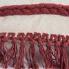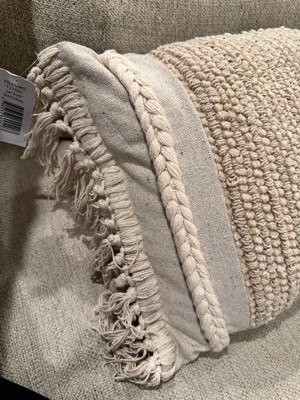 This cozy and heavily textured accent pillow from Rizzy Home is the perfect modern craft piece to bring transitional style to any space. With a unique colorway of terra cotta and brick, this gorgeous pillow features macramé knotted fringe on each end and its heavy texture will add subtle dimension to any sophisticated living space. The braided accent stripe ties the design together with monochromatic colored yarn for a stunning finish. Place this elegant pillow in any room of your home for an effortless designer look.