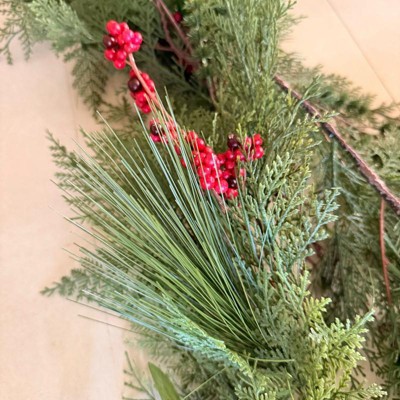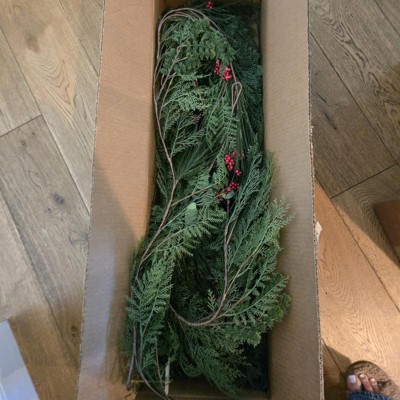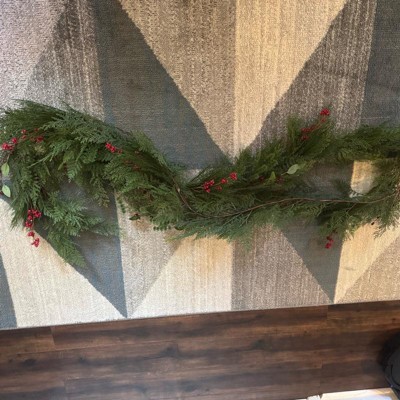 Add festive charm to your holiday celebrations with this Holiday Garland from Threshold™ designed with Studio McGee. This holiday garland features faux cypress leaves, pine needles and red berries that help create a nature-inspired look. Suitable for indoor use only, you can arrange this 144-inch garland on stair railings, above your fireplace mantel, or across windows to create an enchanting display.