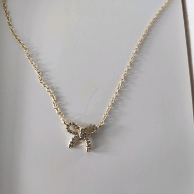 Add a sweet finishing touch to your look with this 14K Gold-Dipped Cubic Zirconia Bow Necklace from A New Day™. Designed with a dainty bow pendant lined with tiny sparkling stones, this necklace adds a touch of glam to any outfit. The gold-dipped chain sits comfortably at your collarbone and fastens securely with a lobster claw clasp. Perfect for everyday wear, this pendant necklace layers beautifully with other pieces or shines solo for a simple statement.