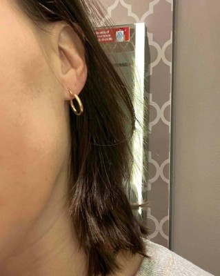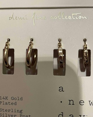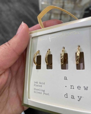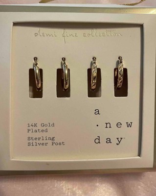 [This review was collected as part of a promotion.] This is a two piece set of 14 karat gold plated earrings from A New Day brands. They have a sterling silver post and are approximately a half inch by half inch in a hoop design. One pair is a smooth hoop while the other pair has a diamond cut design to it. Perfect for every day wear. I received an incentive to write this review.