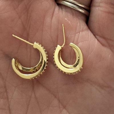 Add some attitude to even the simplest of your outfits with these 14k Gold-Plated Cubic Zirconia Faux-Duo Pave Hoop Earrings from A New Day™. The open-hoop earrings feature two lopsided rows paved with clear crystals that are linked at the ends with a front-facing cutout to form an absolutely stunning design. Set on post hardware with butterfly backs for secure wear, these crystal hoops are made of 14K gold-plated, nickel-free metal in a gold finish. Best of all, these earrings come elegantly packed in a box so you can gift them to friends or family members.