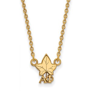 - Unique Features - Show your greek life spirit with this Alpha Phi Sorority necklace. It is crafted with yellow gold plated silver and is 18 Inches in length. The pendant is 12mm in width and 9mm in height (0.47 in x 0.35 in) and dangles from a 1.25mm wide cable chain. We are a certified Collegiate jewelry retailer and this authentic item is licensed by the Alpha Phi Sorority and Greek Life. This pendant necklace is made the USA.