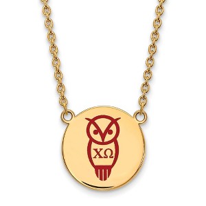 - Unique Features - Show your greek life spirit with this Chi Omega Sorority necklace. It is crafted with yellow gold plated silver and is 18 Inches in length. The pendant is 19mm in width and 19mm in height (0.75 in x 0.75 in) and dangles from a 1.95mm wide cable chain. We are a certified Collegiate jewelry retailer and this authentic item is licensed by the Chi Omega Sorority and Greek Life. This enameled pendant necklace is made the USA.