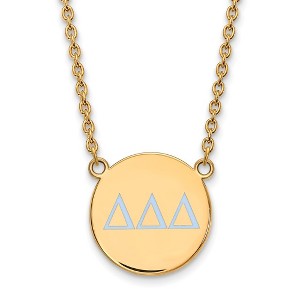 - Unique Features - Show your greek life spirit with this Delta Delta Delta Sorority necklace. It is crafted with yellow gold plated silver and is 18 Inches in length. The pendant is 19mm in width and 19mm in height (0.75 in x 0.75 in) and dangles from a 1.95mm wide cable chain. We are a certified Collegiate jewelry retailer and this authentic item is licensed by the Delta Delta Delta Sorority and Greek Life. This enameled pendant necklace is made the USA.