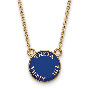 - Unique Features - Show your greek life spirit with this Theta Phi Alpha Sorority necklace. It is crafted with yellow gold plated silver and is 18 Inches in length. The pendant is 12mm in width and 12mm in height (0.47 in x 0.47 in) and dangles from a 1.25mm wide cable chain. We are a certified Collegiate jewelry retailer and this authentic item is licensed by the Theta Phi Alpha Sorority and Greek Life. This enameled pendant necklace is made the USA.