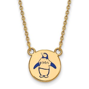 - Unique Features - Show your greek life spirit with this Theta Phi Alpha Sorority necklace. It is crafted with yellow gold plated silver and is 18 Inches in length. The pendant is 12mm in width and 12mm in height (0.47 in x 0.47 in) and dangles from a 1.25mm wide cable chain. We are a certified Collegiate jewelry retailer and this authentic item is licensed by the Theta Phi Alpha Sorority and Greek Life. This enameled pendant necklace is made the USA.