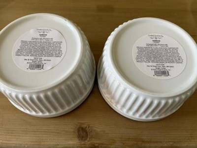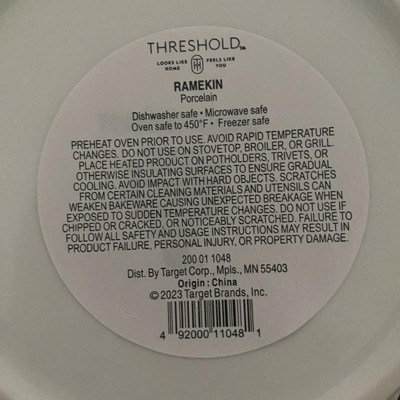 Q: Are these actually oven safe? Purchased one recently and the label on the bottom says dishwasher and microwave safe, but nothing about the oven. There seems to be conflicting information on the pages for other Threshold ramekins.