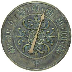 The Blanc Fleur Aged Bronze indoor/ outdoor thermometer from Infinity Instruments is proof that thermometers can have style and flair. This 15 inch versatile wall thermometer has a weathered aged bronze finish, open-faced design, and features a raised fleur-de-lis pattern in the center. With bold Arabic numerals and hand, you can easily read the humidity in any outdoor space. This decorative thermometer is water-resistant, and accurately reads the ambient temperature from -40 degrees to 120 degrees Fahrenheit.