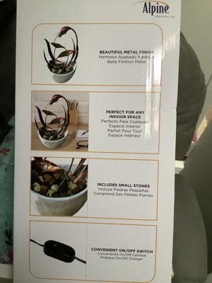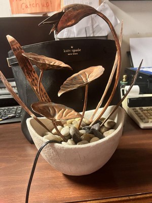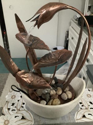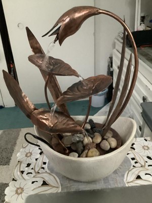 [This review was collected as part of a promotion.] I have had this Alpine corporation table top fountain for several weeks now and I am so pleased with how beautiful it is. I love the oval basin filled with smooth rocks and delicate copper colored foliage and flowers coming up and out of the basin, castcating water down onto each cupped leaf, finally resting in the rocks in the basin. This fountain brings beautiful tranquility and delicate style to my living space.