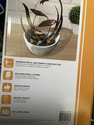 [This review was collected as part of a promotion.] This is a very nice fountain. It will made a great addition to any home and will go with any decor. It’s soothing to watch and listen to the fountain run. I love to watch it run and you can hear the water running and dripping. The top portion with the leaves and flower is made with copper metal and the bowl is cement. It’s all very rugged and rustic looking but yet beautiful. I personal would have liked it cleanly made. It also has stones of all colors and shapes. It was easy to assemble, it comes with instructions. All I needed to do was had distilled water to avoid it getting corroded. It has a convenient on/off switch. Overall a very nice fountain that I think could have been made a little cleaner and stronger. One of the long leaves on made seems like it may break off at anytime, they are made to bend and move.