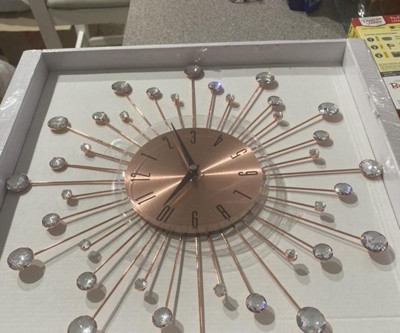 - Glam style decorative clock with metallic copper finish, large sans serif clock numbers, and radial arms with large clear faux crystals