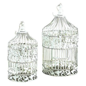 Set of two 22 and 15 inch french country inspired distressed white finish iron round hanging and standing birdcages with floral and bird design, domed tops with hangers, door openings and flat bottom bases. Perfect decor for both indoor and outdoor settings. Provides both decorative and functional purposes.