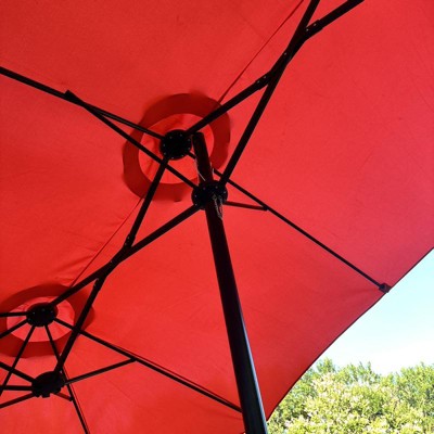 Measuring 15ft x 9ft, our double-sided umbrella provides a wide coverage of shade to allow several people getting together to chat under sunny days. Besides, the patio umbrella comes with sturdy metal structure and sun-protective fabric, which can ensure high durability and protection. And the bottom base is constructed with a crossed metal frame, 2 sand bags (a filled sand bag weighs 90lbs) and an external cover, so you don't need to buy an enhanced base additionally. Furthermore, this outside patio umbrella has user-friendly crank mechanism that helps you to open and close the umbrella with ease by rotating the crank handle. In a word, our patio twin umbrella is perfect for outdoor use, such as backyard, garden, poolside and fairground.