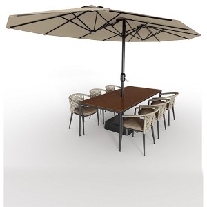 - 【Large Coverage Area】Dimensions: 15(L) x 9(W) x 7.5(H) FT. The extra-large patio umbrella offers a generous shading area of up to 135 sq ft when fully open. It can be used with 2-8 person patio dining set. The outdoor umbrella for rain or shine is the necessary furniture for the summer courtyard, great for patios, gardens, and pools.